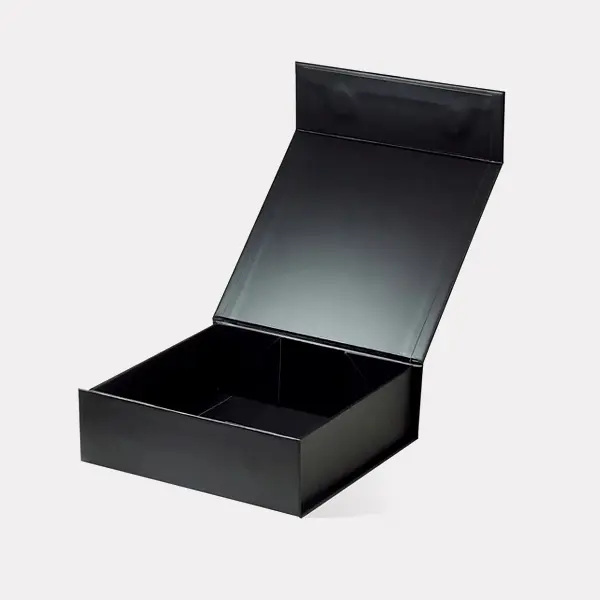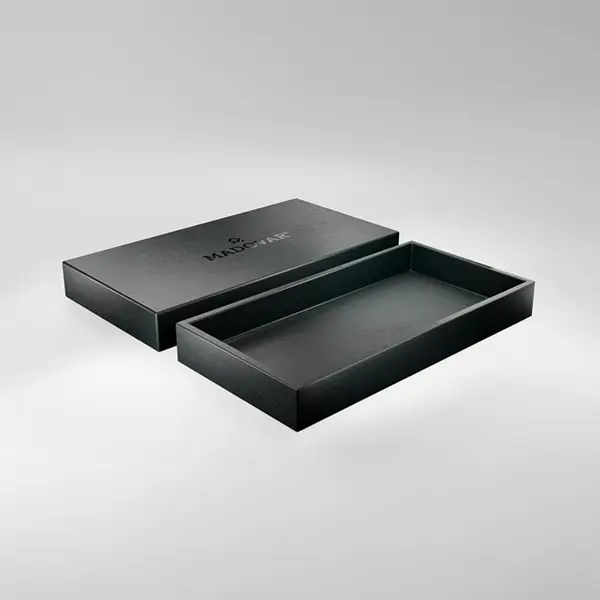 Clean and Simple: The classic two-piece rigid box. Matte black top lifting off the matte black base. Simple, elegant, perfect.