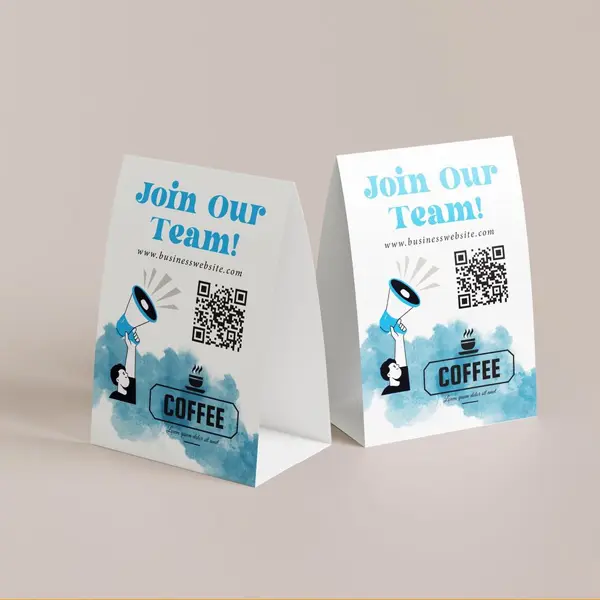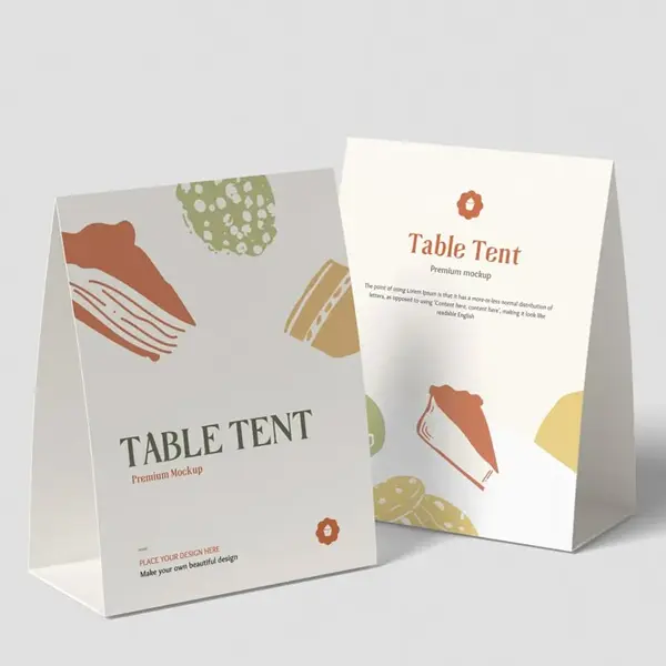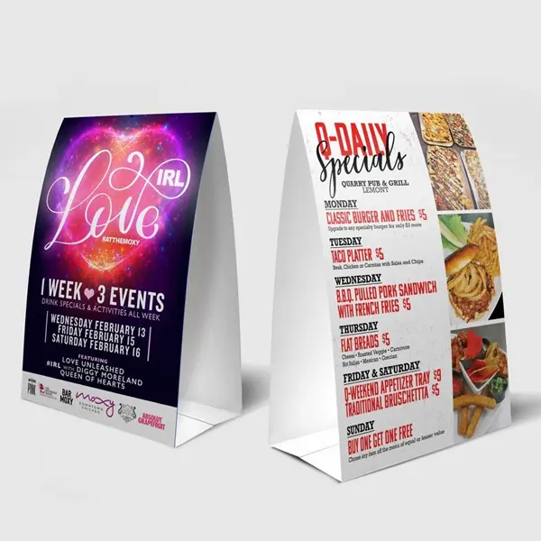 Table tents designed with sturdy materials and high-quality printing, ideal for menus, promotions, and branding, helping businesses attract attention and communicate offers directly to customers.