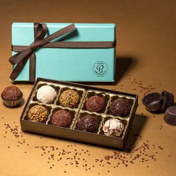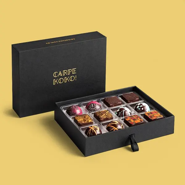 • The Classic Lift-Off: Our two-piece (telescope) box is timeless. The lid slides off smoothly, revealing the perfect grid of truffles below. Clean, deliberate, elegant. Perfect for the 4-pack or the big 16-piece assortment.